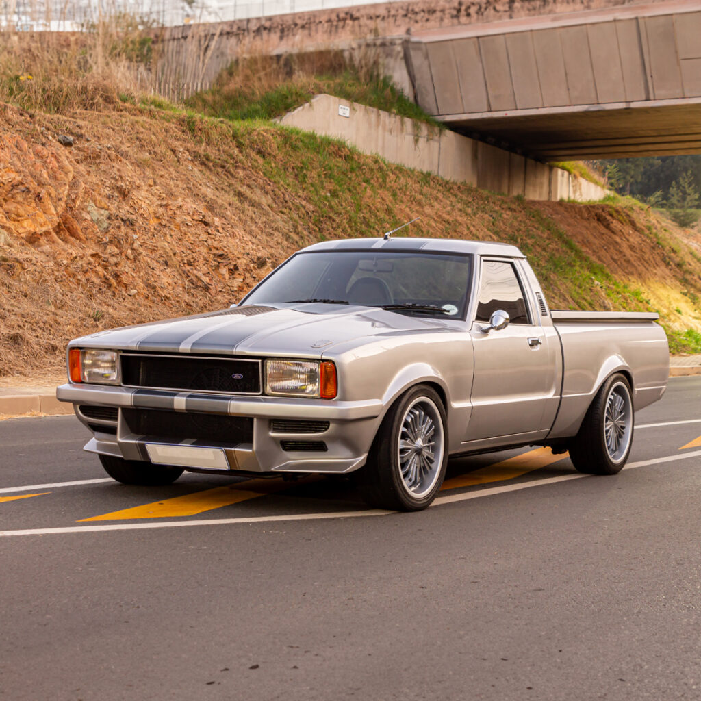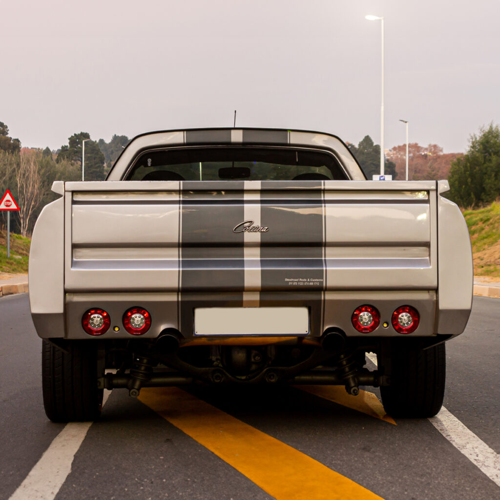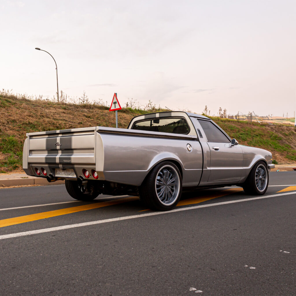 A Labor of Love: The transformation wasn’t just under the hood. Willie and his team at Steelroad Rods & Customs poured their souls into every inch of the Cortina’s bodywork. Fender flares, front spoilers, and bonnet scoops were meticulously fabricated, while a custom Sikkens-based silver paint job with a hint of red pearl brought the bakkie to life.